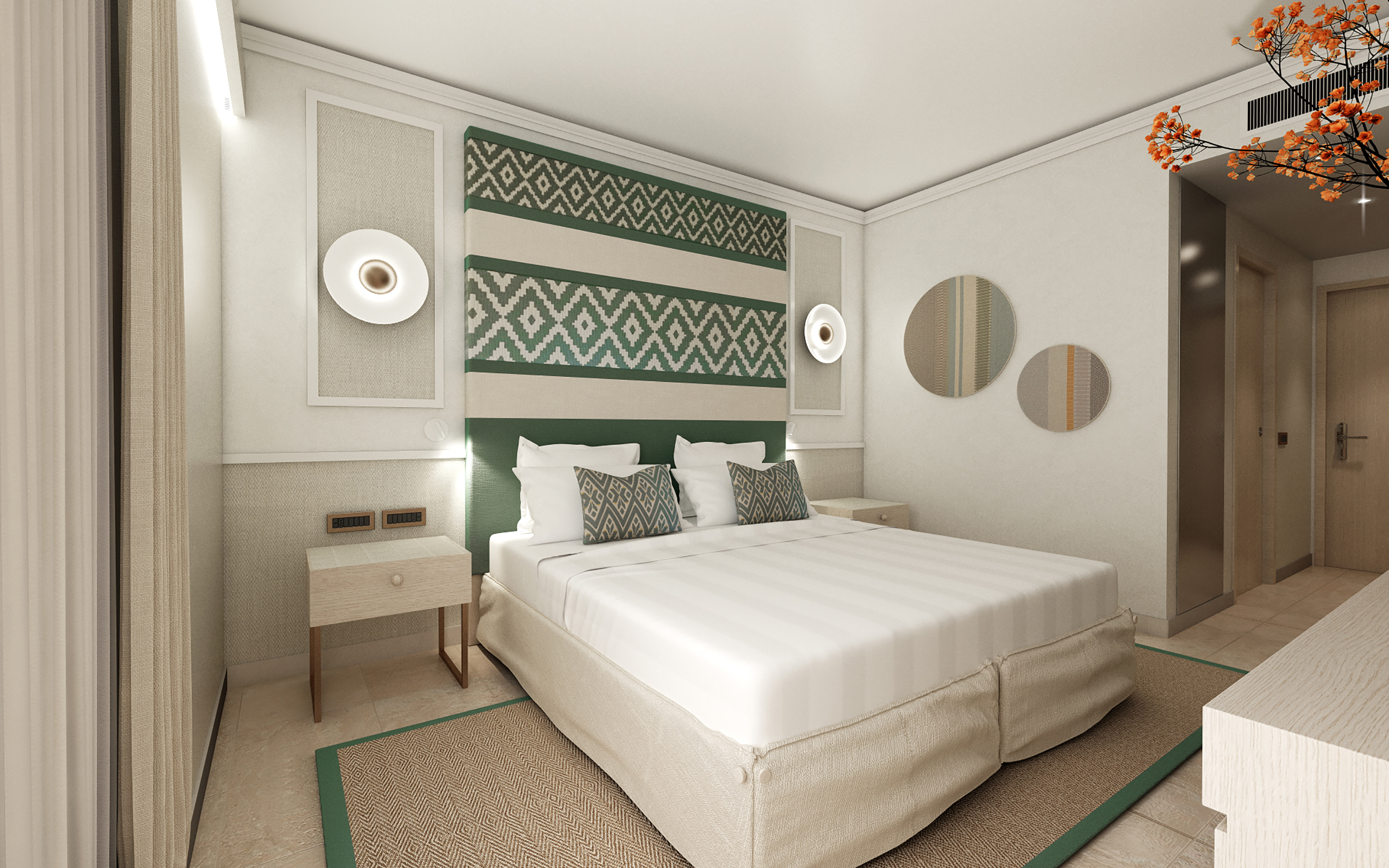 Hotel disponuje celkem 238 pokoji a suitami ve 3 patrech (z toho je 14 bezbariérových), všechny mají balkon nebo terasu s posezením a jsou vybaveny klimatizací s individuální regulací, smart TV/Sat s rádiem, minibarem (zdarma každý den 0,5 l neperlivé a perlivé vody, ostatní nápoje za poplatek), setem na přípravu kávy a čaje, trezorem a telefonem, samozřejmostí jsou župany a Wi-Fi připojení.