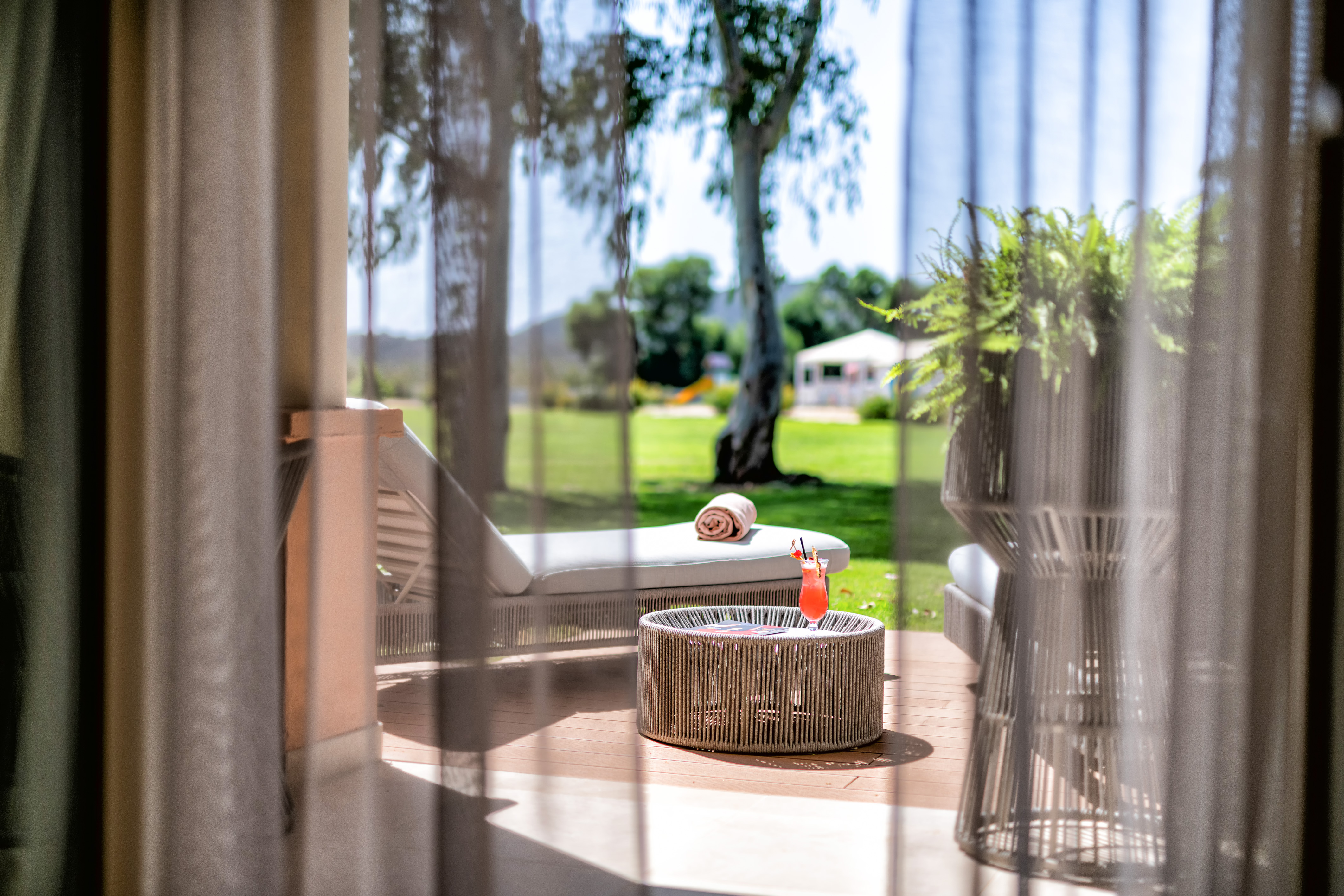 SUITE PRESTIGE s výhledem na lagunu (45 m²): prostorné rodinné pokoje s oddělenou ložnicí s manželskou postelí king-size a samostatnou šatnou a obývací částí s rozkládací pohovkou, smart TV v každé místnosti a privátní předzahráda s posezením směrem k laguně. Koupelna je vybavena walk-in sprchou, dvěma umyvadly a oddělenou toaletou. Max. obsazenost 2 osoby.
